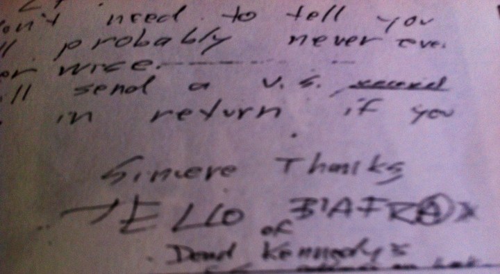 A los tres meses, para nuestra sorpresa, nos llega un gran sobre con una carta escrita de puño y letra por el mismo BIAFRA junto al vinilo recopilatorio de los DEAD KENNEDYS «Give me convenience or give me death», recién editado por aquel entonces. El sobre también incluía un catálogo con las nuevas ediciones del mencionado sello discográfico.