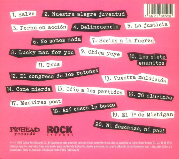 Este nuevo ataque de La Polla Records comienza, como no podía ser de otra manera, con “Salve”, mostrando cuál será el propósito de este disco. La mayoría de las versiones están “potenciadas” respetuosamente. Ya que hay poco rock nuevo interesante en el mundo, viene bien un recuerdo de cómo deben ser y sonar las verdaderas bandas de rock. Estos regresos, aunque (aparentemente) puntuales, nos permiten llenarnos el alma y el cuerpo de la música que orienta nuestra vida.