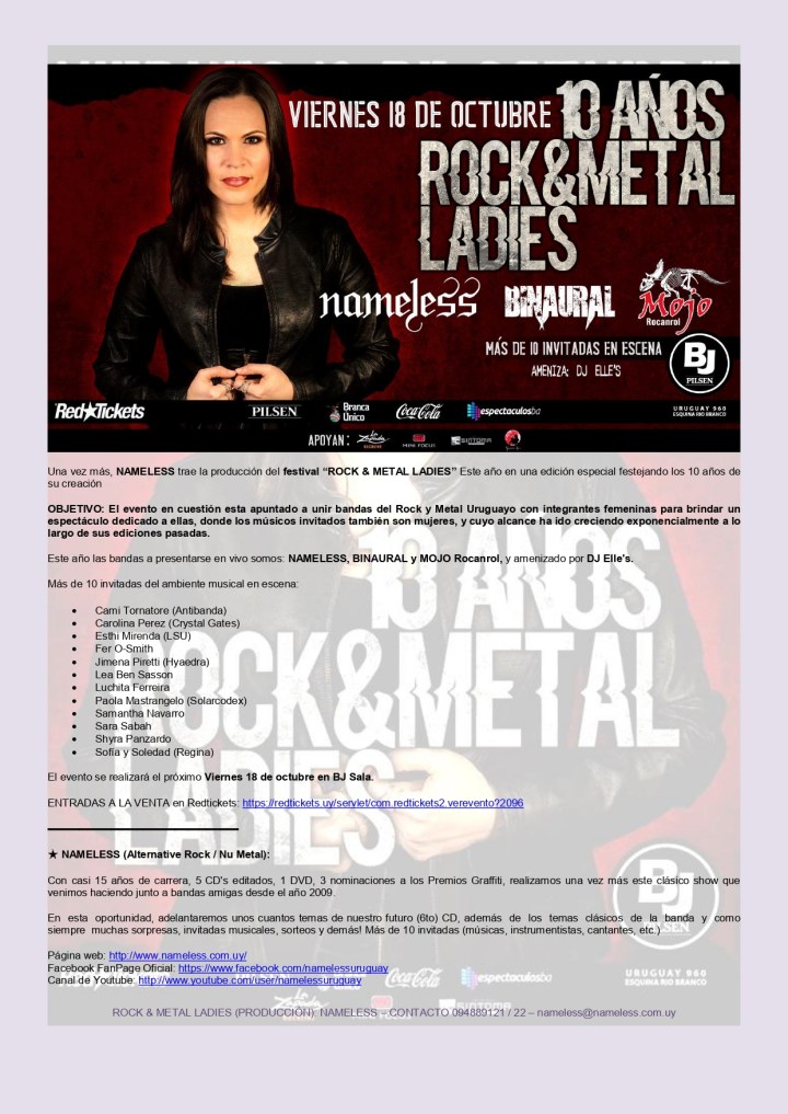 Terrible show este 18 de octubre, de la mano de las chicas del rock y del metal. Nameless, Binaural y Mojo Rocanrol nos invitan al concierto de los 10 años del Rock & Metal Ladies para que podamos ver juntas a más de 10 artistas uruguayas del rock y el metal. Para no perdérselo. Pero para profundizar en el evento y obtener algunos detalles, entrevistamos a Betina Sánchez, vocalista de Nameless y figura impulsora de esta fiesta.