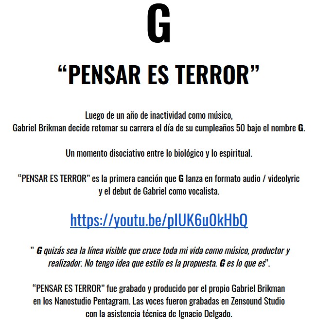 Y finalmente sucedió lo inevitable, que Gabriel Brikman rompiera su autoimpuesto silencio musical para entregarnos dos avances descomunales, demoledores, de su nuevo proyecto denominado G. «Pensar es terror» y «Corro» son las dos pistas que anticipan más de lo que seguramente vendrá a la brevedad.