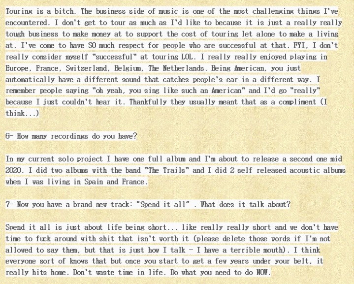 Max: En mi proyecto en solitario actual, tengo un álbum completo y estoy a punto de lanzar uno a mediados de 2020. Hice dos álbumes con la banda The Trails e hice 2 álbumes acústicos solista cuando vivía en España y Francia.