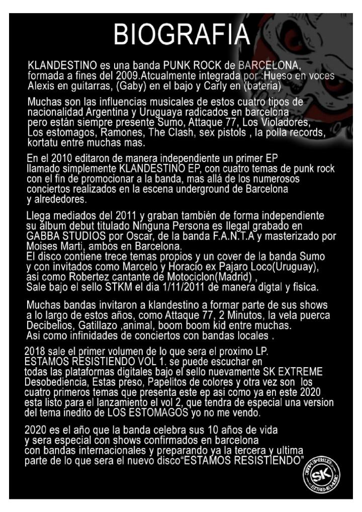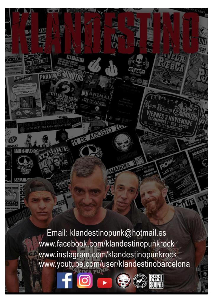 Alexis: Bueno, todo comienza casi en el 2010. Yo soy de Uruguay y dio la casualidad que vino la banda uruguaya Buitres de gira a España, y su baterista Nicolás tocó en Pájaro Loco, banda de punk rock que yo y tres amigos más teníamos en Montevideo por los años ’90. Así que como el bajista y vocalista de dicha banda también vivían en Barcelona, decidimos juntarnos un domingo a divertirnos y recordar viejos tiempos, y me fui a casa con la sensación y las ganas de que tenía que volver a tocar la guitarra con amigos. Así que me puse en campaña de formar una nueva banda, ya que estos amigos por temas de laborales y familiares, no tenían tiempo. En conciertos o bares de la ciudad de Barcelona fui conociendo gente y encontrándome a la vez con viejos amigos de la música que también radicaban en la ciudad de Barcelona. Así que no fue difícil conseguir gente para armar Klandestino.