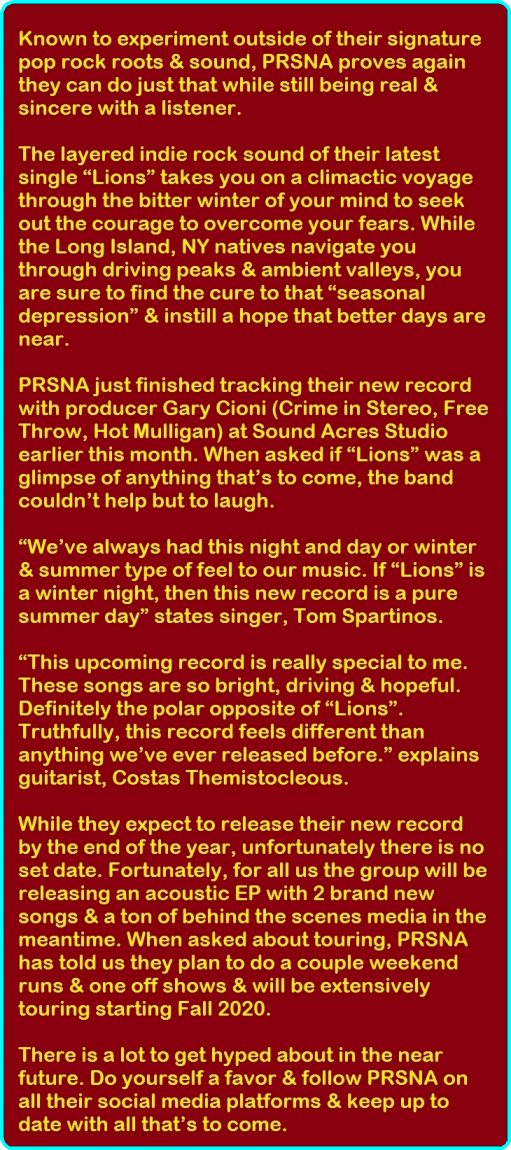 Conocido por experimentar fuera de sus raíces y sonido de pop rock característicos, PRSNA demuestra nuevamente que puede hacer eso sin dejar de ser reales y sinceros con el oyente. El sonido indie rock en capas de su último single «Lions», lo lleva a un viaje climático a través del amargo invierno de su mente para buscar el coraje para superar sus miedos. Mientras que los nativos de Long Island, Nueva York, lo guían a través de los picos y los valles ambientales, seguramente encontrará la cura para esa «depresión estacional» e infundirá la esperanza de que haya días mejores.