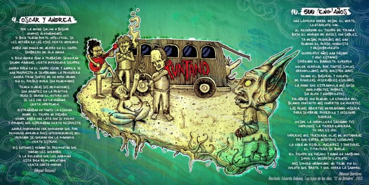 Gonzalo: el arte lo hizo Nicolás Rodríguez (Ezcaravago de nombre artístico) especialmente para el disco. La historia es un poco siguiendo el hilo de las letras, ir acompañándolas con ese personaje creado para Puntano (esa especie de duende cruza con diablo). Bueno, tienen esa continuidad los dibujos, como bien decís Ariel (préstenle atención al brazo izquierdo del personaje a medida que avanza el disco). Todo el arte diseñado por Ezcaravago fue compaginado y puesto a disposición de Saciando Tus Caprichos por Aldo Lacassy (el apache audiovisual), un excelente diseñador gráfico de la ciudad de Florida, que es el realizador del video lyric de «500 engAÑOS». Nos queda pendiente ponerle nombre a ese duendecillo, ja ja.