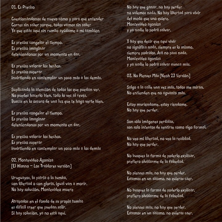 Alejandro: Yo quería grabar “Viviendo en Uruguay”, que la está grabando Gabriel Brikman. Nosotros ya tocábamos temas de Traidores; inclusive una vez hicimos un show con Juan cantando siete u ocho canciones. Fue para una ocasión especial, y fue un show para el cual ensayamos. De cualquier manera, ninguna de esas canciones era “Montevideo agoniza”. Y yo no veía a El Umbral tocándola. A Catalina Records le dijimos que sí participábamos, pero nos tardamos en elegir la canción, y nos quedó ésta para hacer. Yo daba muchas vueltas porque pensaba que no me iba a salir, tenía como una lucha interna. Creo que al final logré hacer la versión cuando me olvidé de Juan. Agarré la guitarra y la canté como a mí me parecía, que es una onda Sex Pistols. Y si te fijás bien, es muy diferente cómo está cantada. Y creo que ahí fue el acierto. Lleva un montón de arreglos, va más rápido. Lo de Manini fue casi anecdótico, pero no sé ni de dónde salió: el silencio lo teníamos. Engloba lo bueno de traer una canción de 30 años atrás, que todavía es aplicable.