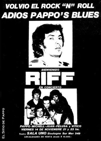 «Sentados» (junto con el Pez -luego bajista de Cross- y Charlie -luego contador de Agadu-) en primera fila y grabando el show. La banda nos arrollaba tema tras tema. Nunca habíamos visto algo igual. Cuando terminaron le dije al Pez «yo quiero una banda así» (con el Pez y el amigo Charlie teníamos un trío, Ovejas Negras). El show no se llenó, lo cual también era obvio, y no terminó de sonar nunca bien, lo cual era más obvio aún. Lo que pocos o ningún asistente quizás haya sabido es que el que tocó la segunda no fue el Boff de la banda sino el Conejo Jolivet (otro joven ascendente en esa época con su banda Dulces 16). Hicieron temas como era igual esperado de Pappos Blues y presentaron algunos de Riff y su reciente y primer disco, Ruedas de Metal. Al terminar subimos al escenario y los tipos eran unos personajes. Michel Peyronel era sacado de otro planeta. Nada de eso se veía por estas tierras… Les hago una pequeña nota a cada uno, luego fotos (cosas que no sé por dónde andan, aunque sí encontré el concierto) y hago amistad con un enorme tipo que, al día de hoy y 40 años después, es un grosso que trabaja en España y sigue moviendo shows, bandas, etc.: Mundy Epifanio.