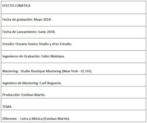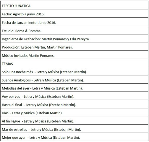 Les compartimos un pequeño adelanto de lo que va a ser el nuevo disco de Efecto Lunática de Argentina, la banda integrada por Esteban Martín, Damián Elías y Mariano Naites. El nuevo álbum está siendo grabado en estudios Romaphonic, producido por Manu Pineda “actual tecladista de Chano” y Martín Pomares, ingeniero de sonido “actual guitarrista de Chano”.