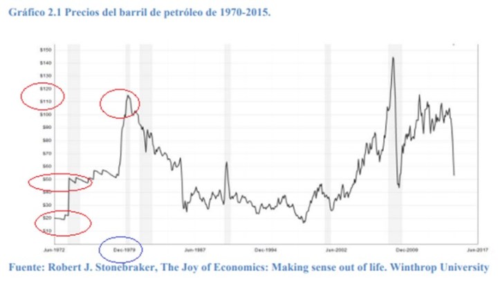 ¿Y qué pasó con el precio del petróleo en 1979? Que llegó a los 115 dólares por barril, cuando históricamente venía de 20 dólares y una subida bestia a 50 dólares luego de lo de Bretton Woods y las devaluaciones. Mirad el grafico: