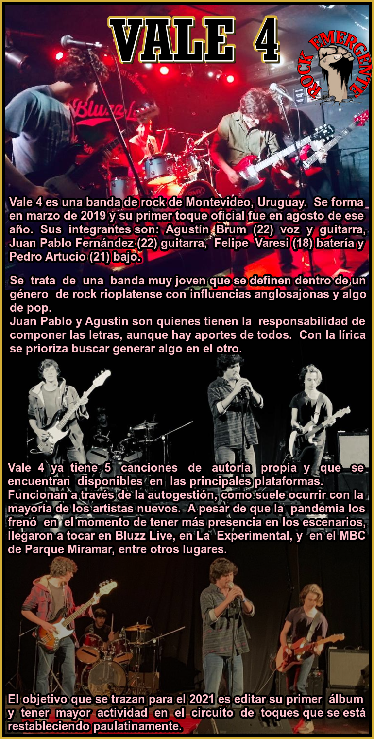 Vale 4 es una banda nueva integrada por gente joven que vienen con la intención de darle al rock local un aire de renovación. Les hicimos algunas preguntas para conocer más sobre ellos y así respondieron.