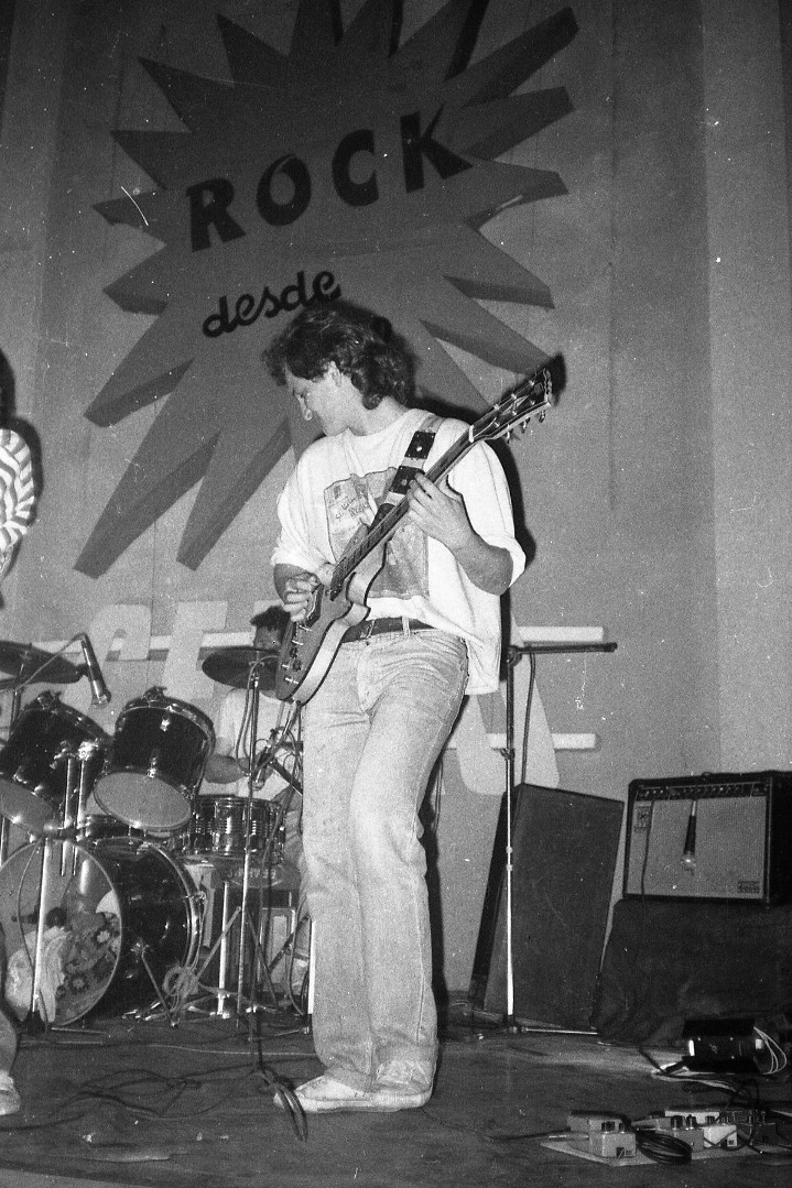 César: El grupo comenzó a llamarse Luz Roja en el ’83. Eran el Quieto, el Garza, Martín, el Pato y Calvo; y ya tocaban el “Rock de la oficina”, que es un tema que todavía se hace; ése era el tema fuerte del grupo. Bueno, después estaban ensayando en un verano en la casa de Jean Paul, que fue el otro guitarrista que vino después, ensayaron con Omar Herrera, y yo fui un poco a hacer el sonido. Resulta que yo tuve un accidente, tuve que estar tres meses en la cama, y después en una silla de ruedas, etc, entonces recién empezaba a dar los primeros pasos, entonces me empecé a meter, a meter, y no sé cómo fue la cosa que terminé cantando yo. Y ahí empezó Luz Roja, que comenzó a trabajar más seriamente a nivel de teatros. Hicimos una grabación en La Batuta de cinco temas en diez horas y que están bien grabados. Eldorado nos aceptó dos temas, los otros tres no, que eran “Vamos juntos” y “Ya ni sé”, que eran los temas más elaborados. Incluso me atrevo a decir que fue de los primeros temas hechos acá que pasó Eldorado. Con Jean Paul estuvimos hasta fines del ’85. El último mes del ’85 tocamos con Carlitos Quintana, el guitarrista de Salario Mínimo, y no dejaron de pasar los guitarristas: pasó Jorge Camero, de Ilegal, el Rafa, después éste (Pablo).