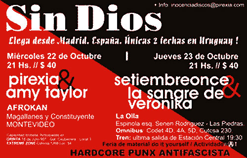 Esta historia pasó hace ya 17 años atrás… Era un miércoles de octubre del 2003 y en Afrokan, reducto de música cubana en el centro de la ciudad, se presentaban los españoles de Sin Dios junto a los locales Pirexia & Amy Taylor. Sin Dios era una banda renombrada dentro del hardcore en español, muy activos y con varios trabajos en su haber. Definidos como banda anarquista, sus líricas iban en consonancia con esas ideas. Cuando me enteré de su venida, me alegré porque era una banda que sonaba en mis parlantes usualmente.