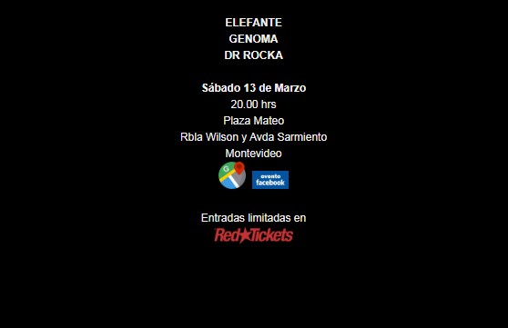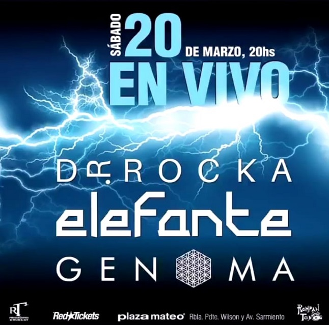Las bandas Genoma, Elefante y Dr.Rocka tendrán una presentación en común en Plaza Mateo el próximo sábado 20 de marzo a las 20 horas. Una inmejorable oportunidad de ver juntas a tres excelentes bandas de nuestro medio. Tres shows de rock con todas las letras en un escenario emblemático.