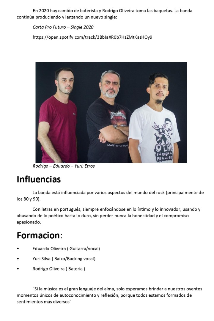 El rock con sus cuatro letras dice presente. Y lo trae Etros, desde Brasil. Suenan potentes, en una muy atrayente propuesta, que ahora encabeza su último lanzamiento, “Cartas pro futuro”. No dejen de escuchar también sus demás trabajos.