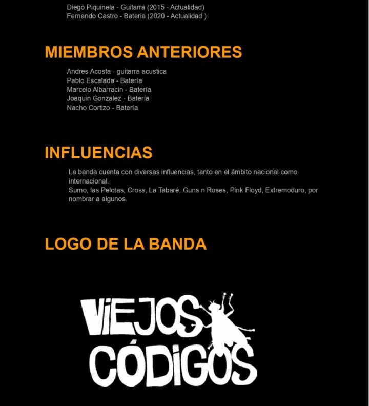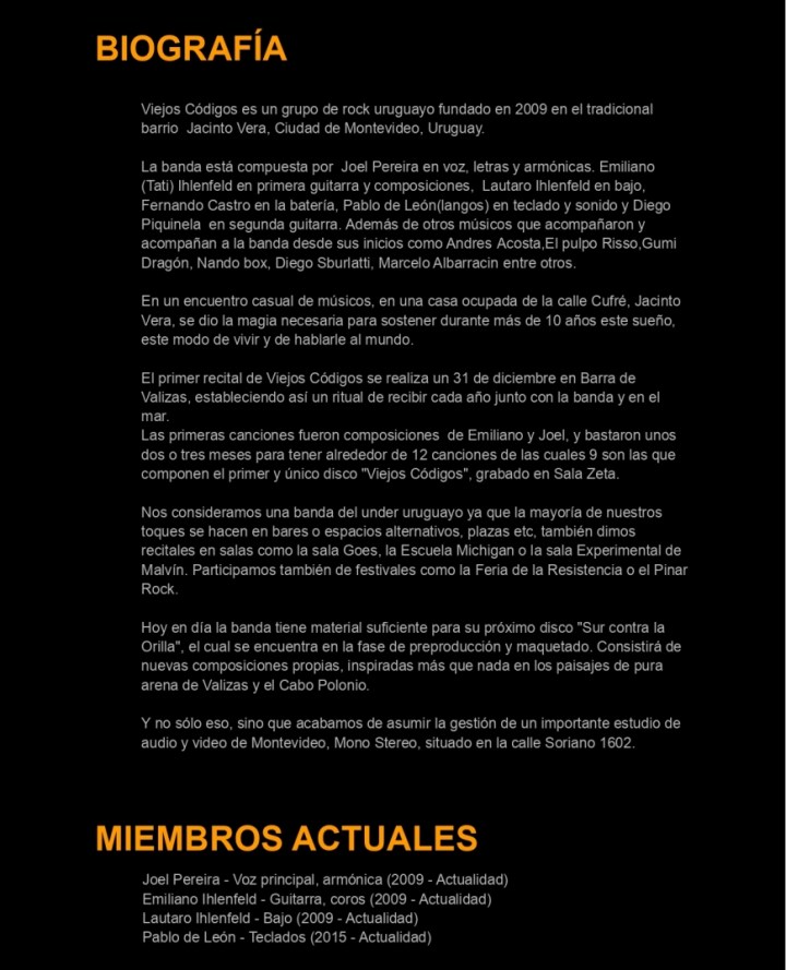 Viejos Códigos es un grupo de rock uruguayo fundado en 2009 en el tradicional barrio Jacinto Vera, Ciudad de Montevideo, Uruguay. La banda está compuesta por Joel Pereira en voz, letras y armónicas, Emiliano (Tati) Ihlenfeld en primera guitarra y composiciones, Lautaro Ihlenfeld en bajo, Fernando Castro en la batería, Pablo De León (langos) en teclado y sonido, y Diego Piquinela en segunda guitarra. Además de otros músicos que acompañaron y acompañan a la banda desde sus inicios, como Andrés Acosta, El Pulpo Risso, Gumi Dragón, Nando Box, Diego Sburlatti, Marcelo Albarracín, entre otros.