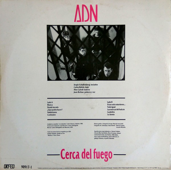 Juan Berhau (voz y guitarra), Carlos Ráfols (bajo), Sergio Schellemberg (teclados) y Nino Cairoli (batería) fueron los responsables de la grabación de Cerca Del Fuego. La importancia del disco se apoya en varios factores. En primer lugar, por la relevancia de ADN en el panorama local. No en vano fueron integrantes de la ensalada Graffiti con el registro de su famoso “Cajas cromáticas”, que supo sonar mucho por las radios y que sirvió de trampolín para llegar a un público variado. También es de destacar el apoyo incondicional de su legión de seguidores en cada espectáculo en que se presentaron.