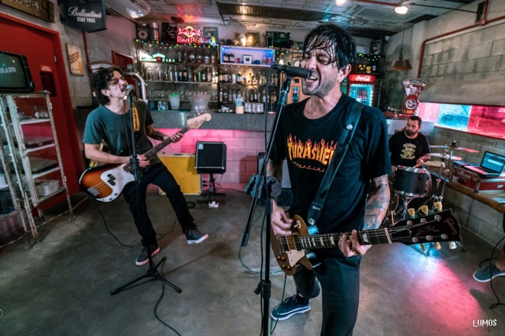 Willson Durand (batería), Vitor Pequeno (bajo) y Matheus Menezes (guitarra) para la grabación del video de «Empty hands», de Dan & The Gummy Hunters.