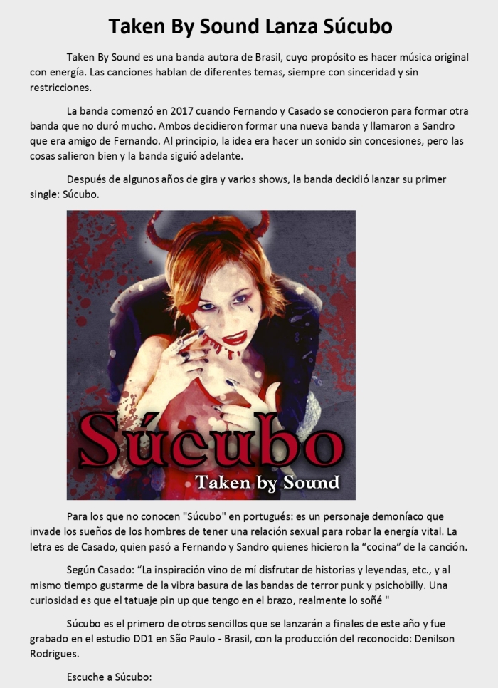 Un sonido claramente rockero nos traen los brasileños Taken By Sound con su primer simple, “Súcubo”. Un muy buen adelanto que surge como prometedor de un futuro al que prestar atención.