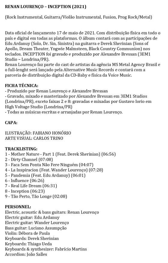 Mucho rock y del bueno. Mucha guitarra y de la buena. Brasil brilla a través de Renan Lourenço, quien nos acerca su excelente disco Inception, para disfrute de todos los amantes del buen rock, o sea, los lectores de Sólo Rock.