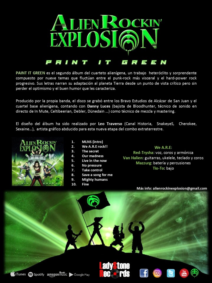 - El mismo día del lanzamiento, que fue el miércoles 24 de junio, a las 20.00 horas, tuvo lugar la PRIMERA PRESENTACIÓN TELEMÁTICA de unos alienígenas sobre la faz de la Tierra. Fue a través de YouTube, donde os hablamos de este nuevo trabajo y contamos con la participación de tres invitados de lujo: nuestro técnico de mezcla / mastering Danny Lights (bajista de Bloodhunter, técnico de sonido en directo de In Mute, Celtibeerian, Debler, Dünedain…); nuestro diseñador gráfico Leo Traverso (SnakeyeS, Cherokee, Sexaine y Ayra, Canal Historia…) y el único e inigualable Maschine Nitrox, presentador del Maschine’s Late Night Show (Wacken Open Air, Full Metal Cruise, Full Metal Holiday…).