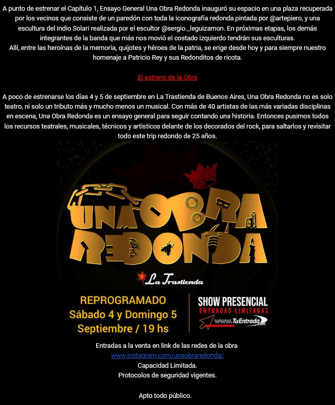 Homenaje A Los Redondos En Plaza Etcheverry (Buenos Aires) en 3 agosto, 20215 agosto, 2021 Comparte esto:Tweet Compartir en Instagram (Se abre en una ventana nueva) Instagram Compartir en Reddit (Se abre en una ventana nueva) Reddit Compartir en WhatsApp (Se abre en una ventana nueva) WhatsApp Me gusta Cargando...