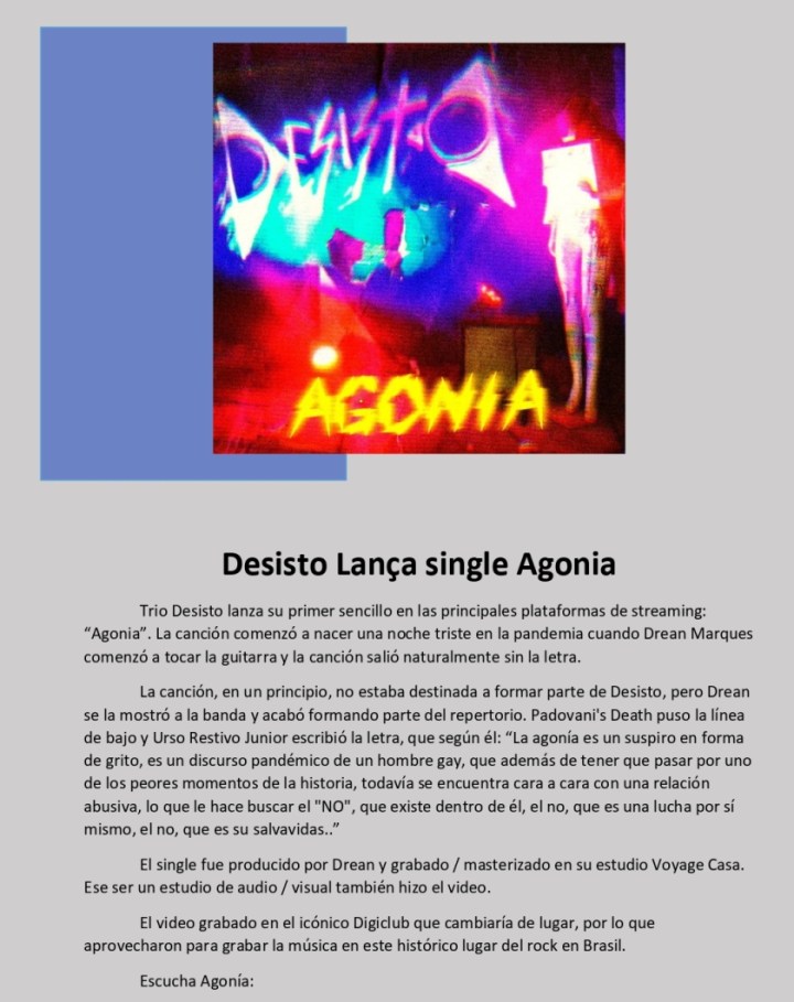 Más música de Brasil, más rock del bueno. Llega Desisto, y nos traen su video de la canción «Agonía». Pasen a escuchar cómo suenan.