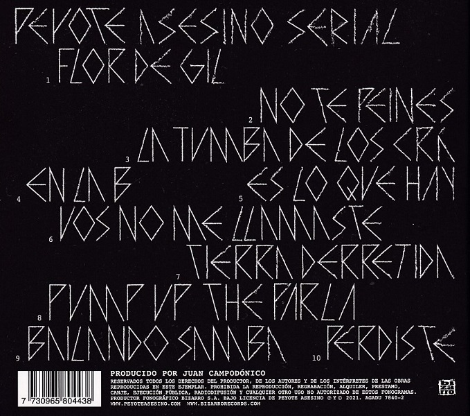Así van pasando “No te peines”, “En la B”, “Tierra derretida” y “Perdiste”, dejando siempre en claro que es el Peyote lo que está sonando. El collage formado por lo aportado por cada músico, se incorpora y define a esa entidad que los nuclea, que tiene vida propia y que han dado en llamar Peyote Asesino. Las letras están plagadas de imágenes y de recursos que también tienen el mismo sello, haciendo fácil identificar que pertenecen a la banda, incluso sólo leyéndolas.