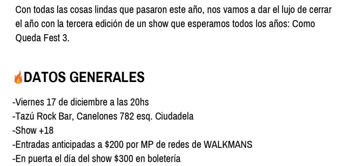 El próximo 17 de diciembre en Tazú Rock Bar, se llevará a cabo el Como Queda Fest III, un festival de bandas jóvenes de rock. Participarán Walkmans, Abril28 y Fake Hppy (Argentina). Según los organizadores: “¡Un festival intenso en el que van a poder escuchar lo mejor de cada banda!”.