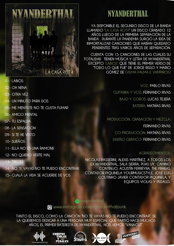 La banda Nyanderthal se despide de este 2021 con la presentación de su disco La Casa Rota. En él podremos encontrar 15 canciones orientadas al sonido punk con sonoridades que invitan a corearlas. Un muy buen aporte que se reparte con diferentes dosis de energía que se combinan con inteligentes tonadas.
