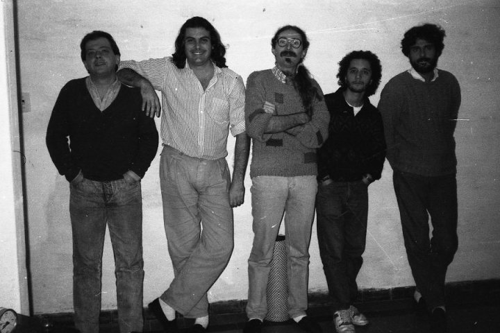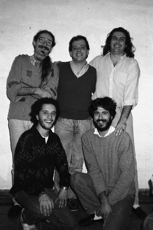 Alberto: Bueno, sigo. En el ’88 viene la cuestión de presentar el cassette. Tocamos en El Tinglado, tocamos como tres veces en Laskina vieja, Circo, Bellas Artes, AEBU, mil lugares más. Después vino el ’89: un año pa’ triqui. Cambio de integración y cambio de repertorio: se van las dos mellizas Piguillen, Diego Ebbeler se va a tocar con Jaime Roos y entra Gonzalo Gravina. Empezamos a hacer nuevos temas y en noviembre hacemos el espectáculo en conjunto con El Cuarteto de Nos en el Teatro Stella.