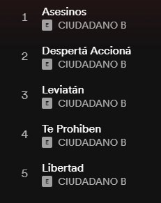 “Asesinos” es explícita desde su título. Una base muy rockera soporta una letra potente, dirigida a quienes ya sabemos: “No me callo más, yo voy a pelear. No me callo más, van a caer. Asesinos”. La segunda canción, “Despertá, accioná”, es como el paso siguiente a su predecesora. Tremenda música para un impacto que dura un minuto, siendo directa y concreta. Sigue “Leviatán”, que se presenta un tanto menos enérgica pero igual en su nivel de potencia y con buenos sonidos. Luego comienza “Te prohiben” y ya se vuelve a sentir que viene otro bombazo… y así es. Una nueva letra clara y directa, como su música. “Libertad” es otro temazo, crudo como debe ser en estos tiempos de tanta dulzura y crueldad. ¿Sustantivos contradictorios? Yo diría que complementarios y cómplices de la situación actual. Vienen muy bien algunos gritos al respecto.
