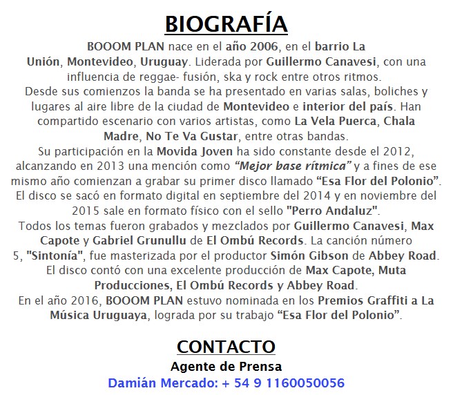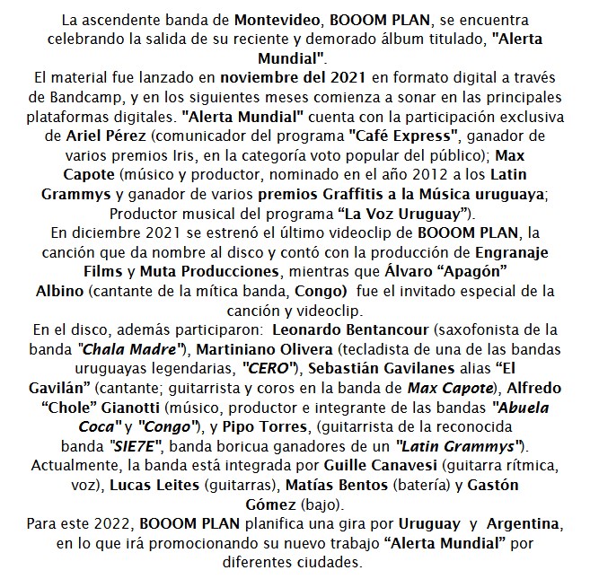 La banda Booom Plan estará presentando este año su último trabajo, Alerta Mundial. El disco, que cuenta con la participación de varios invitados, será llevado a distintos escenarios de Uruguay y Argentina. Los datos, a continuación.