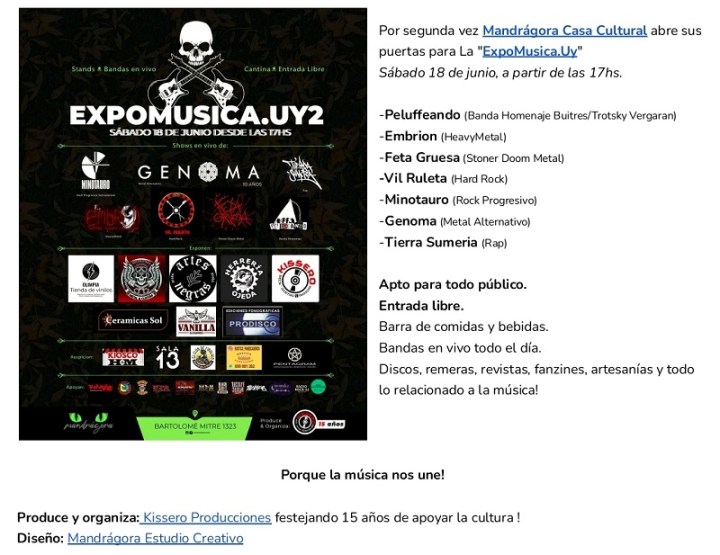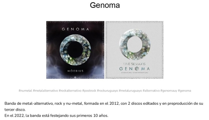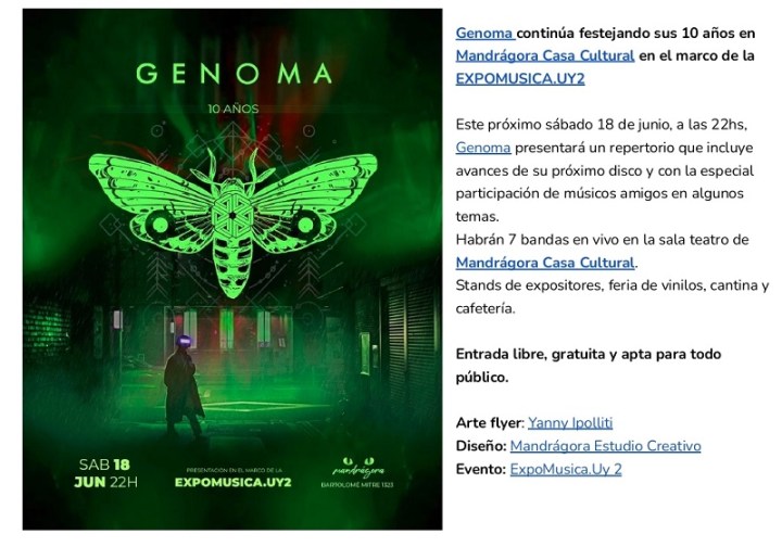 Como parte de los festejos por sus diez años de permanencia como banda, Genoma se presentará en Mandrágora Casa Cultural, participando del evento ExpoMúsica.Uy que se celebrará a partir de las 17 horas junto a seis bandas más: Peluffeando, Embrión, Feta Gruesa, Vil Ruleta, Minotauro y Tierra Sumeria. Genoma, gran exponente de una potente y explosiva combinación de sonidos, se presentará a las 22 horas, ofreciendo avances de su próximo disco. Entrada libre.