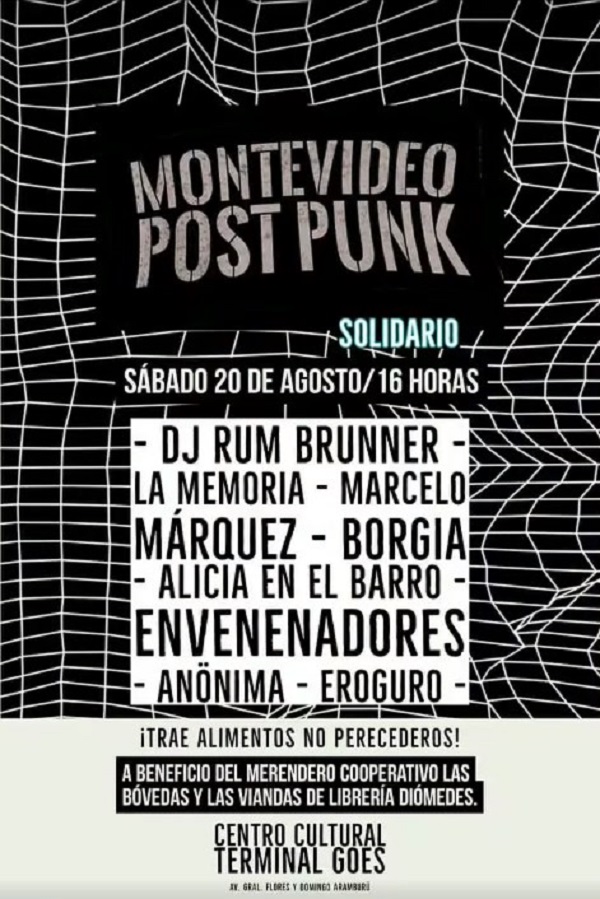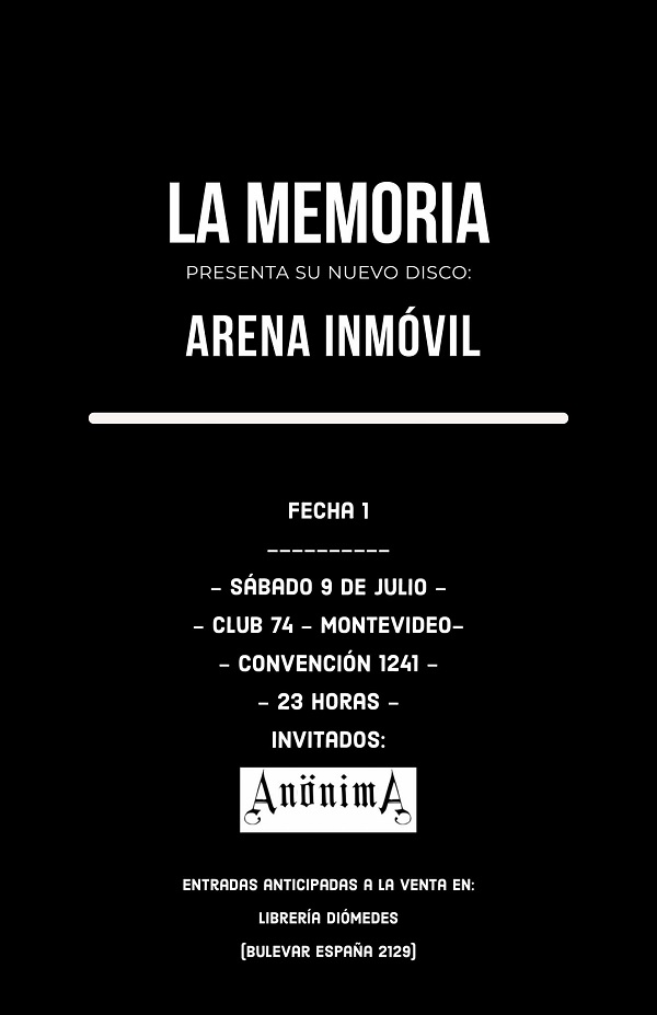 Fabián: Sí, habrá tres más. Después del 9 de julio en Club 74 nos vamos a Durazno a llevar nuestro Arena Inmóvil al El Mitin, el sábado 16 de julio. Es un placer volver a Durazno. Vamos a invitar a subir a cantar a Lalo Puntano (bajo y voz de Puntano). El sábado 6 de agosto presentamos el disco en Cold Music Bar. Tendremos a nuestro DJ André Goldman musicalizando la previa y se subirá mi hermano Fernando Vázquez a tocar la guitarra en algunas canciones de La Memoria. Será un verdadero honor para la banda. Nando es parte fundamental desde un principio en este proyecto. En mi caso es una gran influencia artística y por supuesto humana. Desde su primera banda, Zona Muerta y luego Libertad Condicional y Kali Cool Hooligans, me viene influenciado su música y puesta escena. ¡Los hermanos Vázquez al ataque! Y la última fecha será el sábado 20 de agosto a las 16 horas en el Centro Cultural Terminal Goes, en el Festival Montevideo Post Punk Solidario. Será para recaudar alimentos no perecederos para el Merendero Cooperativo Las Bóvedas de Ciudad Vieja y para las viandas de Librería Diómedes en el Parque Rodó. No pudimos hacer la edición número tres en el 2020 por la prohibición de los espectáculos públicos y ahora lo hacemos solidario. Cada vez hay más gente alimentándose en las ollas populares y obviamente se precisan alimentos. Lo segundo, es una buena oportunidad para ver a siete bandas con estilos diferentes pero dentro de una misma escena, convocados para colaborar y sonar bien. Las bandas son Borgia, Envenenadores, Marcelo Márquez Ropus, Alicia En El Barro, Anönima, Eroguro y La Memoria. Ambientado por el gran DJ Rum Brunner. Las diferencias entre los shows estarán en la lista de canciones a tocar y la participación de diferentes invitados.