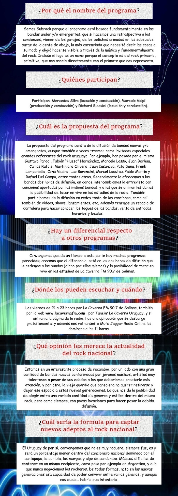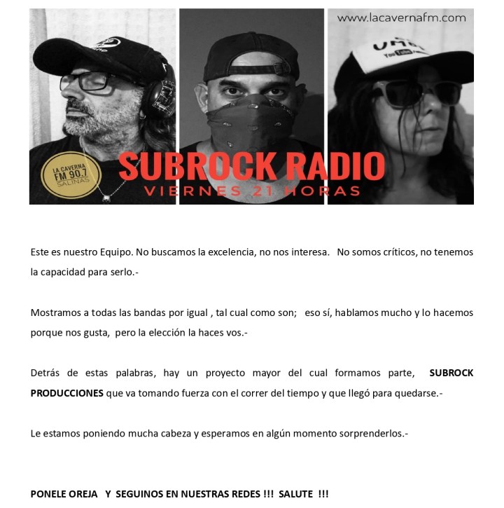 El trabajo de difusión del rock nacional es arduo y se sostiene en esfuerzos individuales o colectivos de gente de dentro del movimiento. Dentro de ese grupo, quienes tienen programas de radio, asumen la grata tarea de pasar música, charlar con músicos y difundir actividades. Con esta serie de artículos denominada Programas Radiales De Apoyo Al Rock Nacional, es nuestro interés sumar la iniciativa de dar a conocer y profundizar el meritorio trabajo de estos colegas. Hoy responden a nuestras preguntas la gente de Subrock Radio.