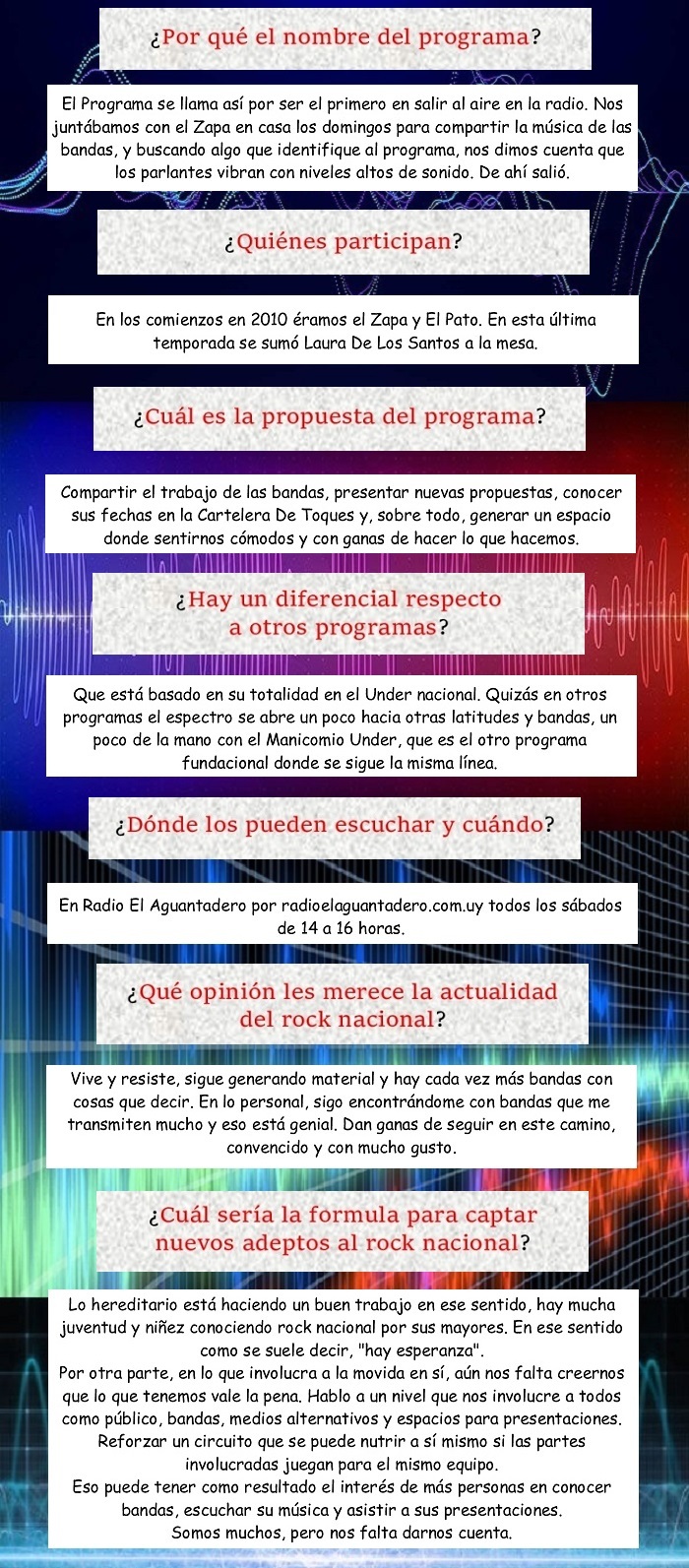 El trabajo de difusión del rock nacional es arduo y se sostiene en esfuerzos individuales o colectivos de gente de dentro del movimiento. Dentro de ese grupo, quienes tienen programas de radio, asumen la grata tarea de pasar música, charlar con músicos y difundir actividades. Con esta serie de artículos denominada Programas Radiales De Apoyo Al Rock Nacional, es nuestro interés sumar la iniciativa de dar a conocer y profundizar el meritorio trabajo de estos colegas. Hoy responden a nuestras preguntas la gente de El Aguantadero Vibra.