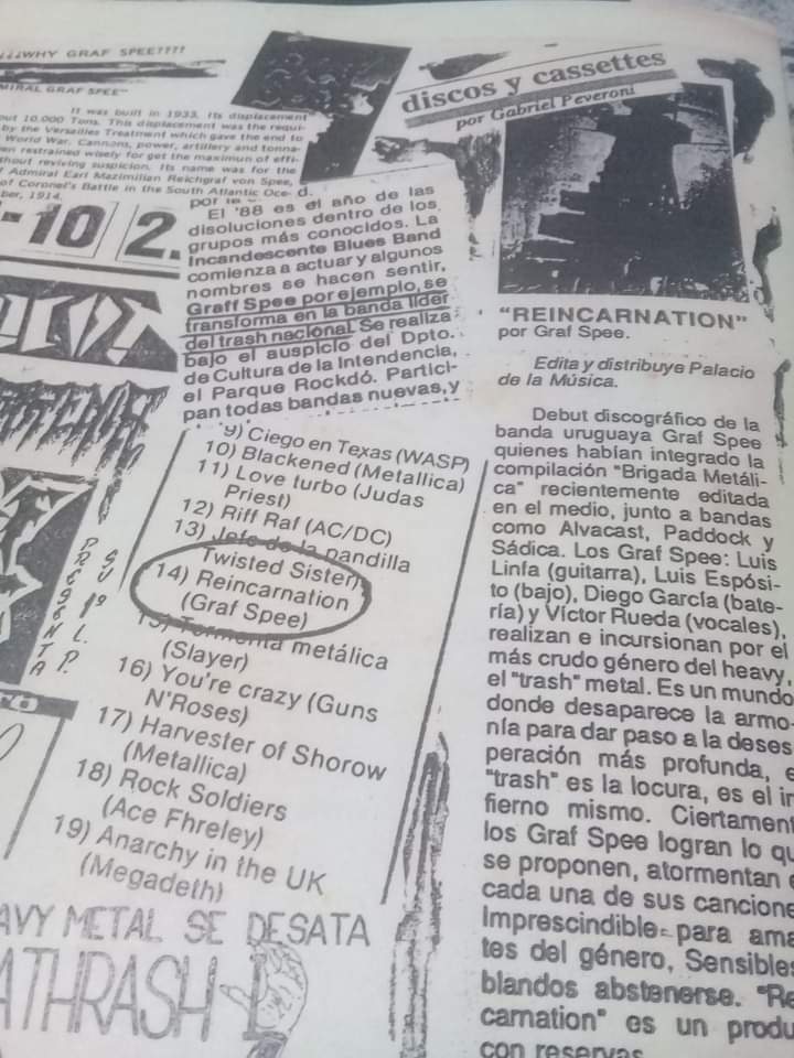 Graf Spee es la agrupación pionera y protagonista de la movida thrash en Uruguay. Les dejo en imágenes el Reincarnation y Brigada Metálica.
