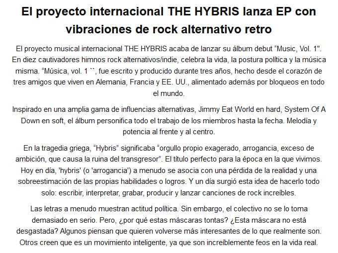 Músicos de Alemania, Francia y Estados Unidos unen sus fuerzas para lanzar The Hybris. Y logran un muy buen resultado con su disco Music, Vol. 1. Recomendamos repasar sus 10 canciones.