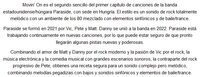De la conjunción de integrantes de Hungría y Estados Unidos, surge la banda Paradise. Presentan su canción “Movin’ on”. Muy buena combinación de sonidos para lograr un resultado destacado.