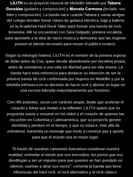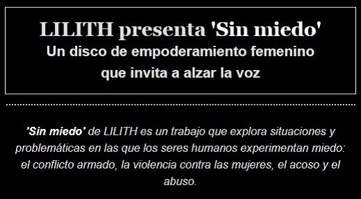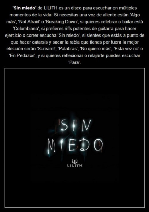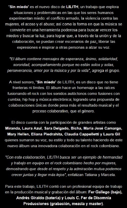 Muy interesante propuesta la de la banda colombiana Lilith. Nos traen los sonidos de su álbum Sin Miedo, con temas actuales, integrando por 11 canciones que los invitamos a recorrer.