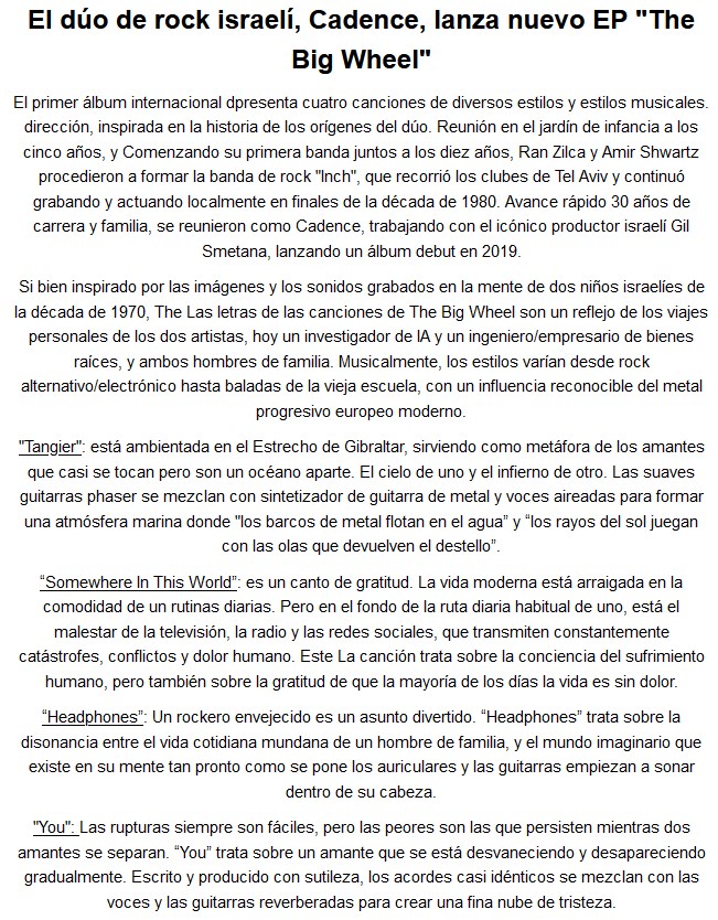 Cuatro canciones nos trae el EP The Big Wheel de la banda israelí Cadence para su primer disco con alcance mundial. Lindas canciones para explorar y disfrutar.