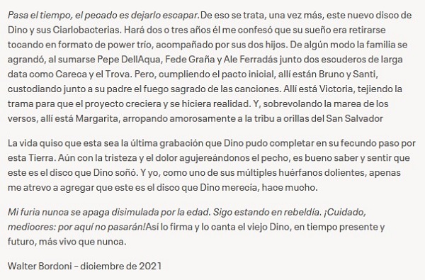 ¿Qué puedo agregar sobre Dino que no se haya dicho? Básicamente, nada, por lo que dejo paso a las palabras de Walter Bordoni, tal cual como figuran en la página de Little Butterfly Records y en el sobre interior.