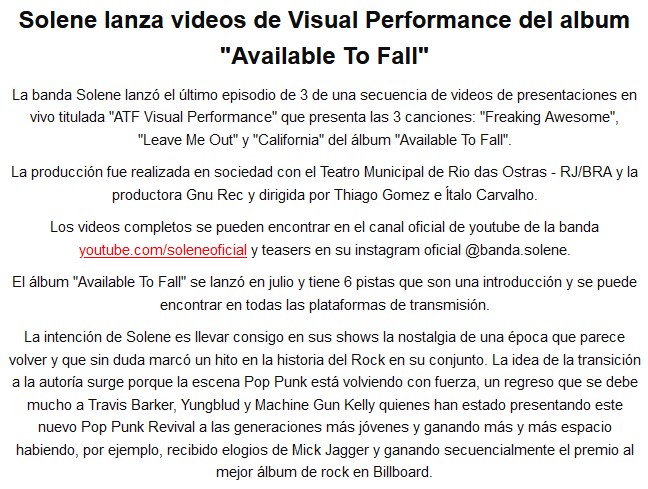 Mucha energía y rock puestos al servicio de la música. Eso es lo que hacen los brasileños de Solene, logrando muy buenas canciones. Pueden comprobarlo a continuación, escuchando y viendo el material de esta banda.