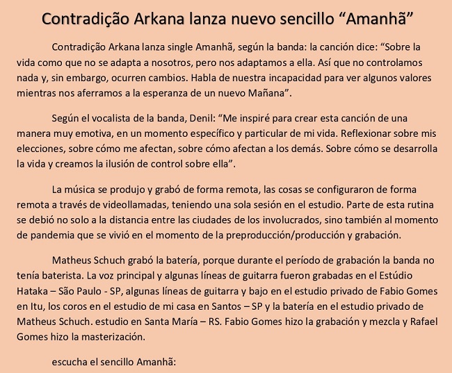 Los sonidos que escucharán a continuación vienen de Brasil. La banda Contradição Arkana nos presenta su simple “Amanhã”, el cual cuenta con una suave introducción para desarrollar luego una muy buena canción de rock.