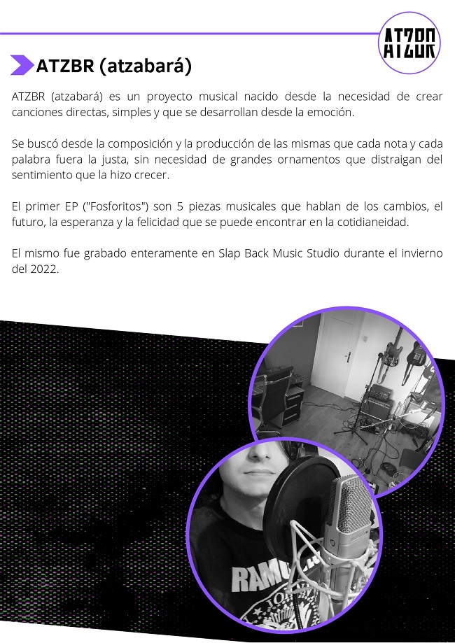 Llega a nuestras manos el primer EP de ATZBR (Atzabará) llamado Fosforitos, compuesto por cinco canciones que están llenas de una frescura que atraviesa el trabajo de principio a fin. Música clara, cristalina pero potente, que son condiciones para que un disco de rock tenga una buena llegada. Canciones inteligentemente creadas para una propuesta interesante.