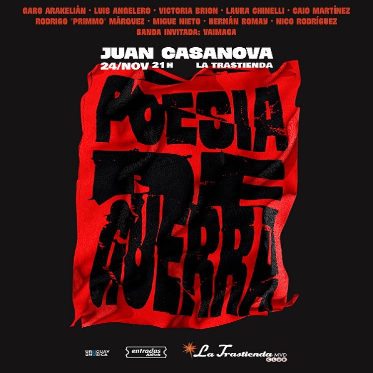 Juan: Poesía de Guerra es una puesta en escena personal con la cual debuté el 30 de julio del 2000 y la idea es simplemente tener un espacio propio, que no sea de las bandas en donde estoy tocando momentáneamente como Traidores, que fue una gran parte de mi vida. Es un espacio donde yo puedo aunar todos los trabajos que ayudé a componer, ya sea con Traidores o con Assimo, que fue otra banda que tuvo cierto recorrido, y también puedo poner en escena otras cosas, como trabajos que compuse con Luciano Supervielle, con la Vela Puerca o con tantos otros amigos. Además es un espacio donde me puedo dar el gusto de versionar autores que me gustan, canciones que me gustan, ya sea de Uruguay como de la región, lo que se me cante. Lo que generé con mi espacio es que puedo hacer lo que quiero caprichosamente, puedo tocar el setlist que yo quiero y además puedo invitar a los amigos que quiero, con los que estoy compartiendo en el momento o que me quiero dar el gusto de tocar y que me aporten su propia apreciación de canciones que de repente son muy viejas. Para Poesías De Guerra, que es un disco de recopilación que es homónimo de mi espectáculo y de mi puesta en escena, trato de sintetizar 20 años de recorrido que llevo con esto, docenas de shows, y docenas de invitados de todas las bandas, es un espacio en donde, si bien soy caprichoso en los contenidos, también les doy cabida a que otras voces, otros creadores reinterpreten , resignifiquen, le den otro valor a canciones que de repente yo ayudé a componer para la historia de la música nacional, que es en buena parte la historia de mi propia vida.