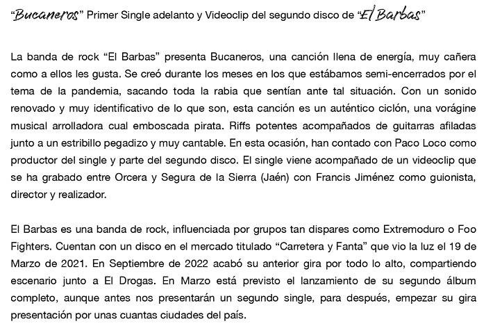 Sonando muy bien, El Barbas llega desde España para traernos su simple “Bucaneros”, adelanto de su segundo álbum, y que también cuenta con un video. Rock and roll en las manos de quienes saben hacerlo. Pasen, escuchen, vean y lean.