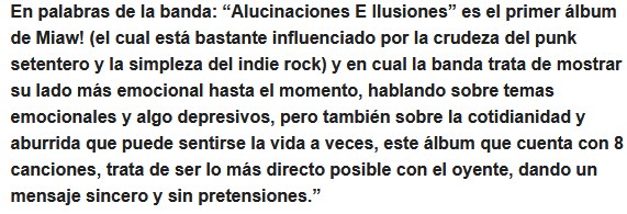 Muy buena mezcla de sonidos rockeros logra la banda Miaw! Llegan desde Perú para mostrarnos su último álbum, Alucinaciones & Ilusiones, que suena fresco y más que interesante. Compartimos, a continuación.