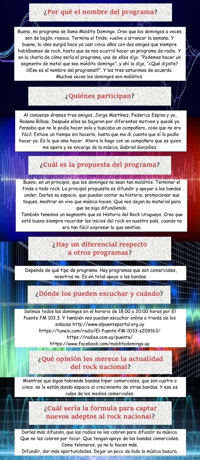 El trabajo de difusión del rock nacional es arduo y se sostiene en esfuerzos individuales o colectivos de gente de dentro del movimiento. Dentro de ese grupo, quienes tienen programas de radio, asumen la grata tarea de pasar música, charlar con músicos y difundir actividades. Con esta serie de artículos denominada Programas Radiales De Apoyo Al Rock Nacional, es nuestro interés sumar la iniciativa de dar a conocer y profundizar el meritorio trabajo de estos colegas. Hoy responden a nuestras preguntas la gente de Maldito Domingo, en la voz de Rosana Bilbao.