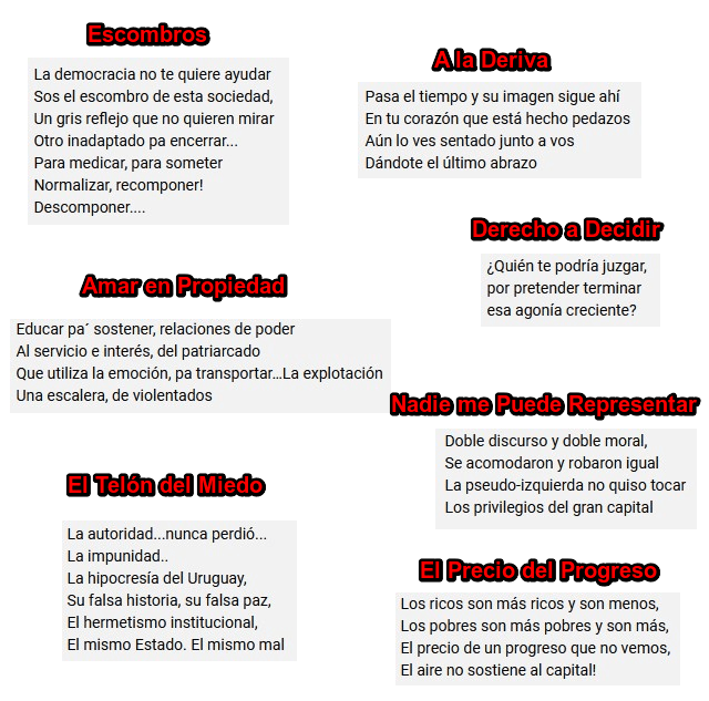 Existe una gran inyección de energía a lo largo de los 10 temas del disco. A una particular y personal vocalización que manifiesta todo el sentimiento, se agrega una expresión musical contundente donde los arreglos impactan y golpean a un ritmo sostenido, provocando que esa energía pegue fuerte. No faltan los solos que tiñen aún más de dramatismo la temática tratada. La violencia de género, las drogas, la soledad, la desesperación, el suicidio y los manejos políticos son los temas que se van tocando en varios temas, repartidos de forma inteligente. Un disco salado, crudo en sus letras que llevan la carga de mostrarnos la cara más dura de las consecuencias de cómo se maneja esta sociedad uruguaya. Comparto algunos extractos, aunque lo más interesante, por supuesto, es recorrer todo el contenido.