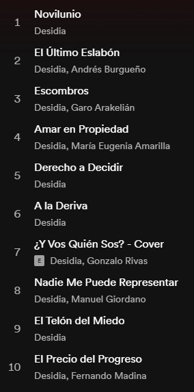 La energía se manifiesta desde el comienzo con “Novilunio” y se extiende hasta el final, con un gran, gran cierre con “El precio del progreso”. Si bien ya habíamos tenido avances como simples en las canciones “Amar en propiedad”, “Escombros” y “El telón del miedo”, la totalidad de los temas terminan redondeando y ampliando la propuesta de Desidia.